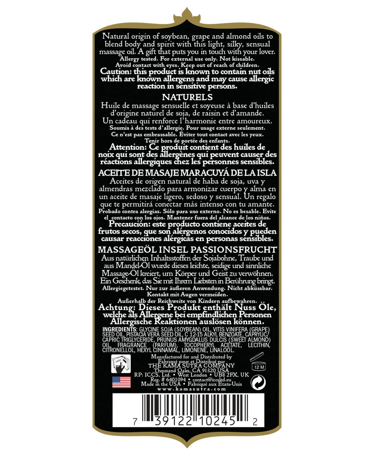 Ingredients: Glycine Soja (Soybean) Oil, Vitis Vinifera (Grape) Seed Oil, Pistacia Vera Seed Oil, C 12-15 Alkyl Benzoate, Caprylic/Capric Triglyceride, Prunus Amygdalus Dulcis (Sweet Almond) Oil, Fragrance (Parfum), Tocopheryl Acetate, Lecithin, Citronellol, Hexyl Cinnamal, Limonene, Linalool
